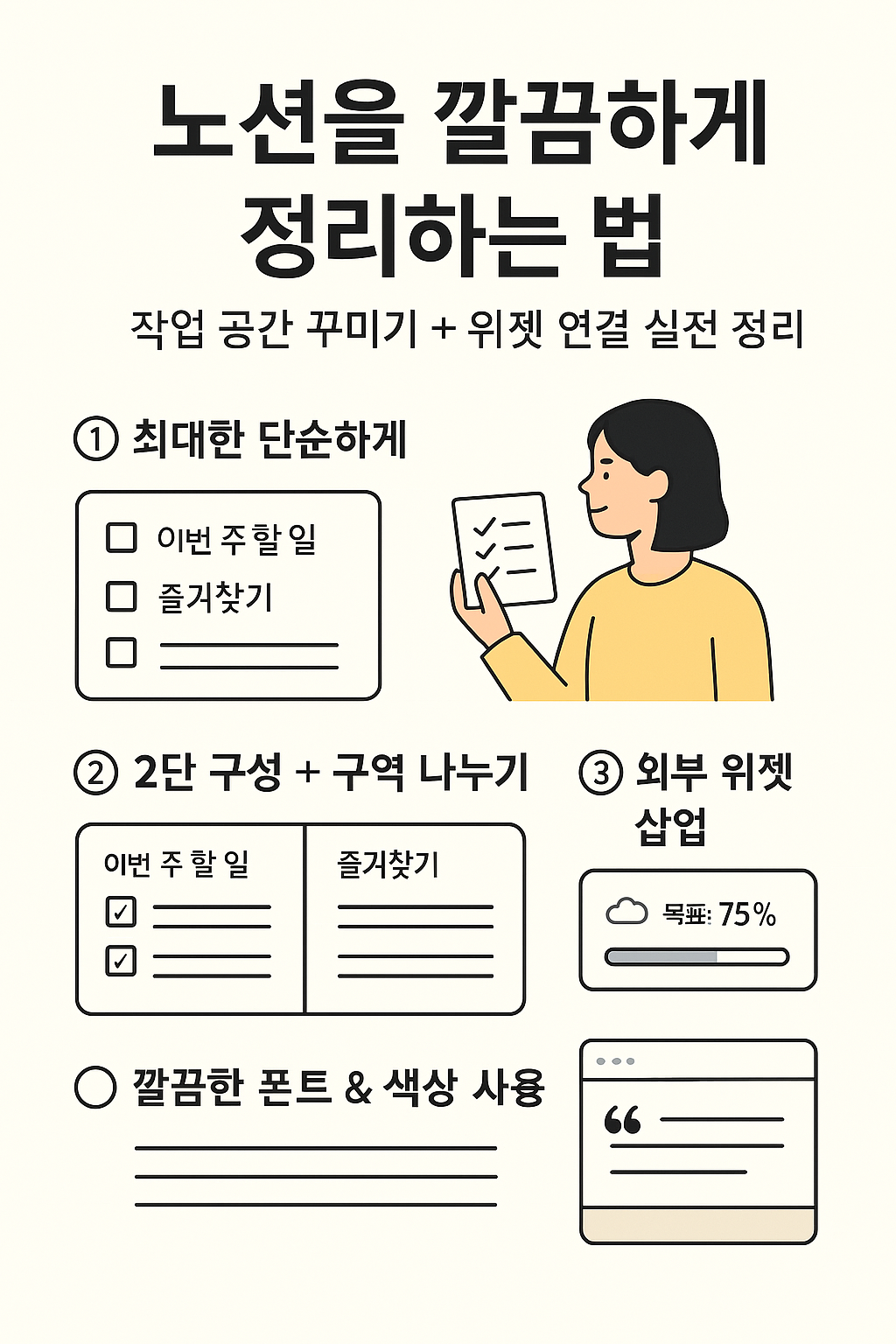 이번에는 노션 작업 공간을 깔끔하게 구성하는 팁과 위젯 추가 방법을 함께 정리해봤다.